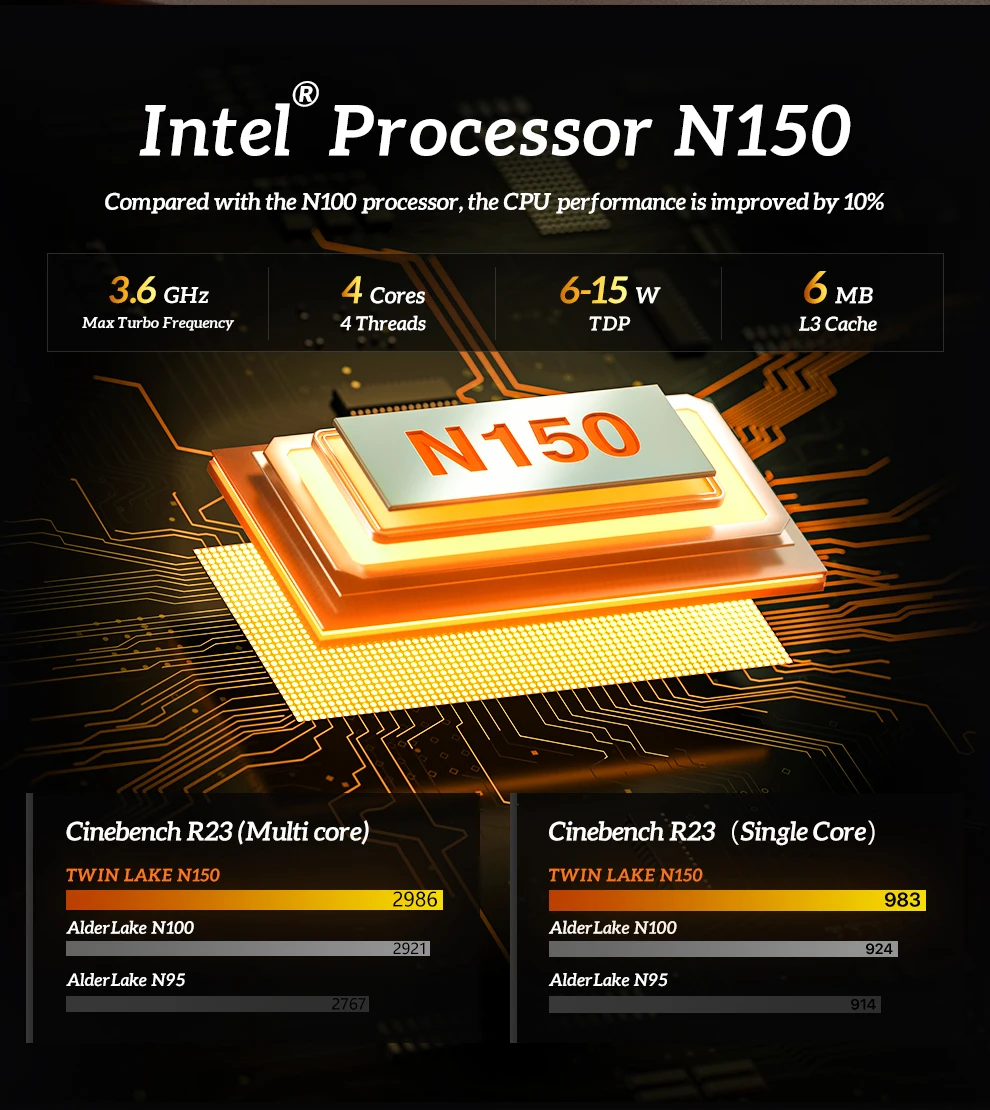 | Modelo do Processador | Twin Lake N150 (até $3.6\text{GHz}$) |