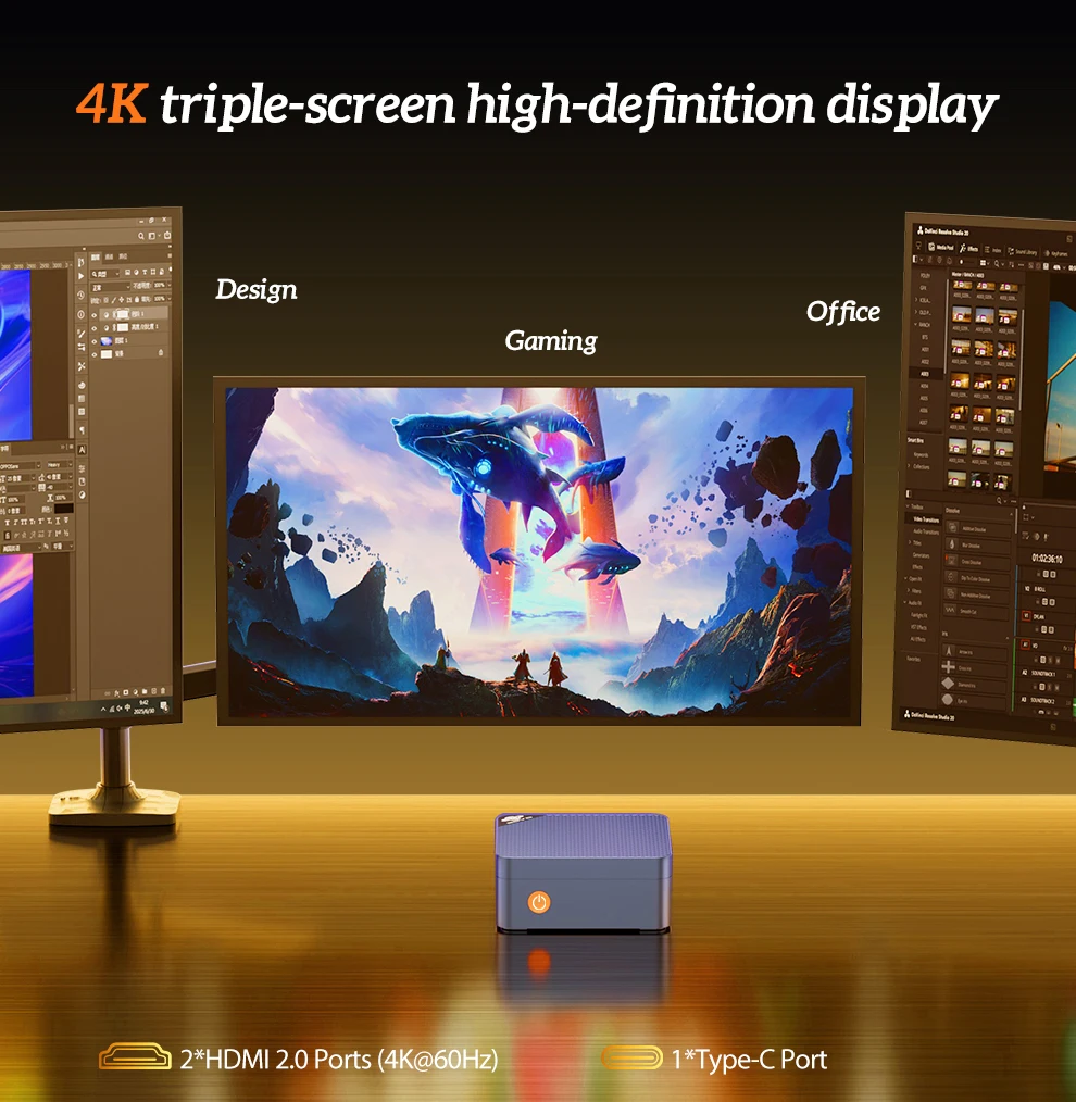 Capacidade de Triplo Ecrã 4K: Com duas interfaces HDMI e uma DP, este Mini PC suporta saída de Triplo Ecrã 4K HD, permitindo-lhe expandir o seu espaço de trabalho ou criar uma estação de entretenimento imersiva.5