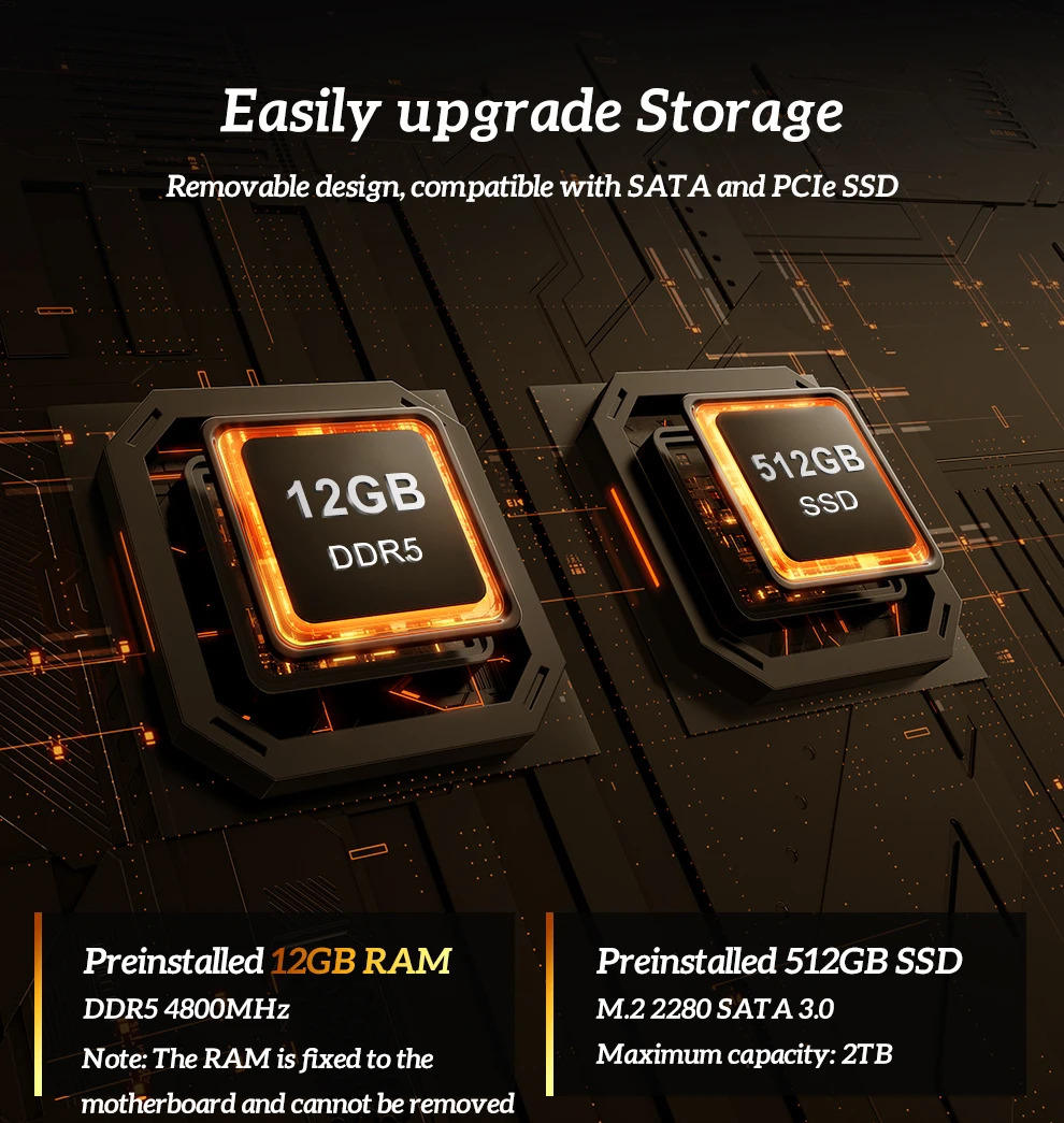 Design Ultracompacto e Portátil: Com um peso de apenas 6$200\text{g}$ e dimensões extremamente reduzidas (cerca de 7$87\text{mm}$ de largura), o SOYO M4 Mini é portátil e pode ser facilmente montado na parede ou atrás de um monitor/TV, libertando espaço na sua secretária.8