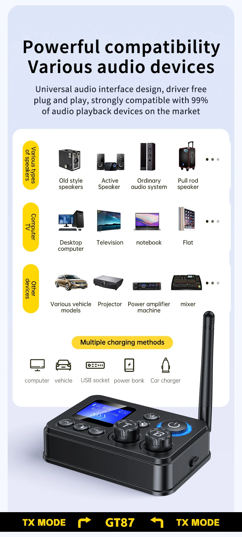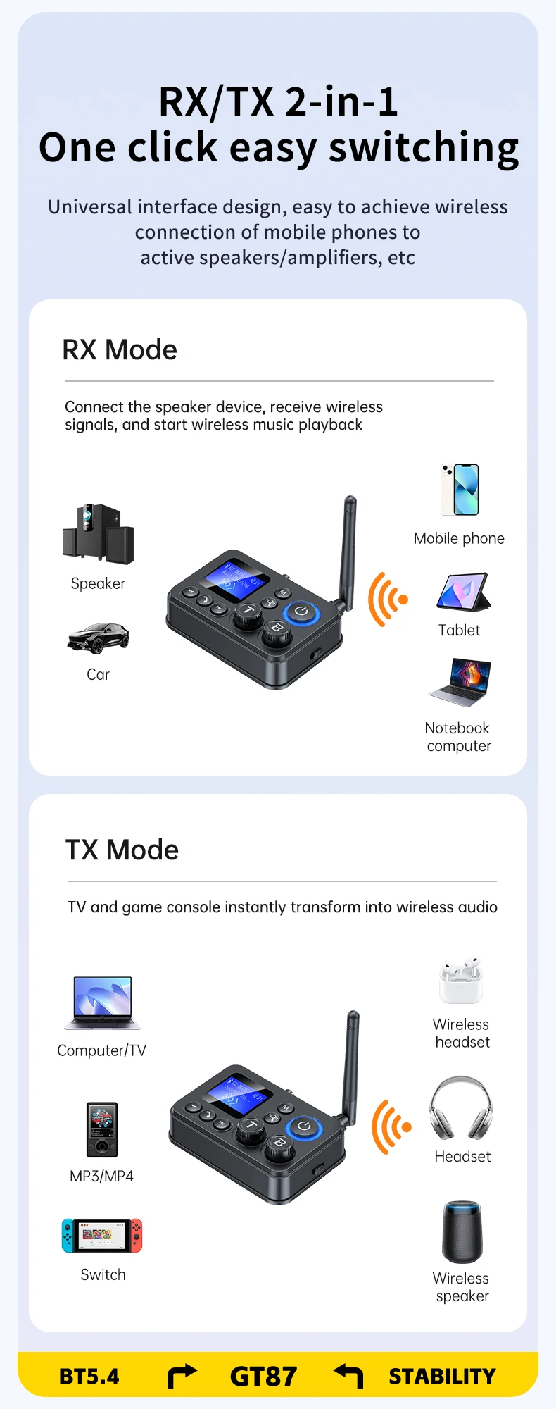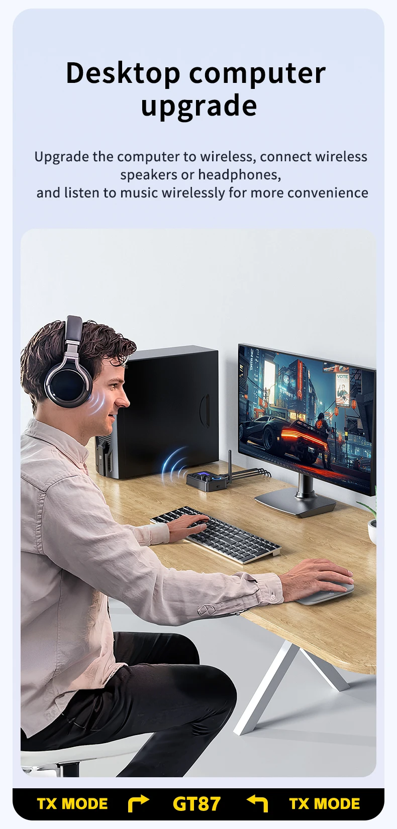 Versatilidade Dupla (Transmissor/Recetor): O GT87 funciona em dois modos: como Recetor, permitindo que colunas ou sistemas estéreo antigos recebam áudio wireless do seu telemóvel; e como Transmissor, permitindo que a sua TV ou PC envie áudio wireless para headphones ou colunas Bluetooth.