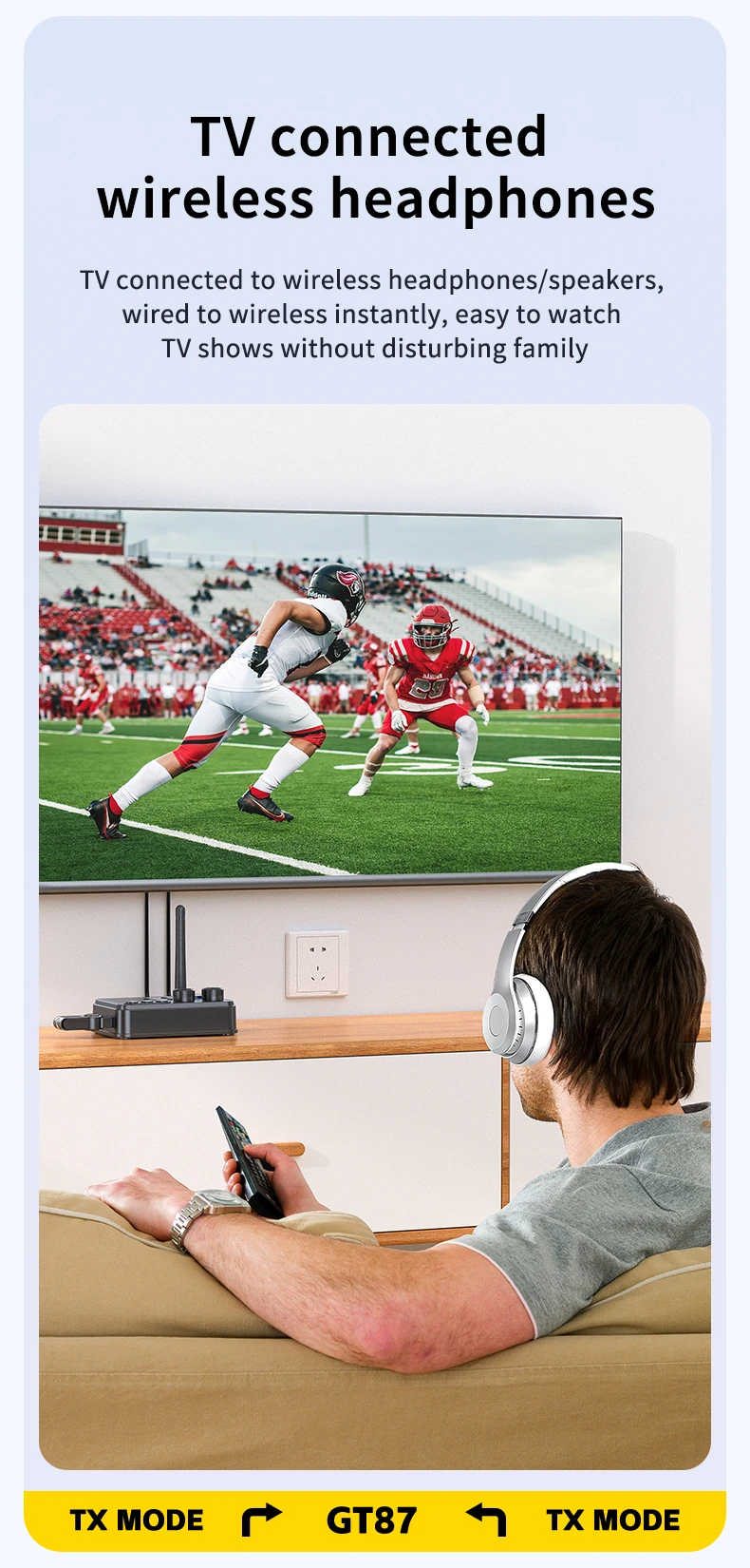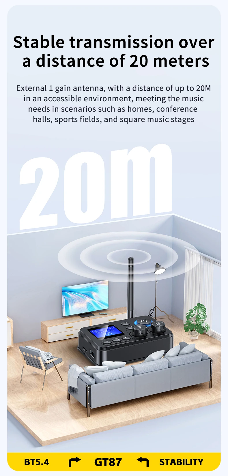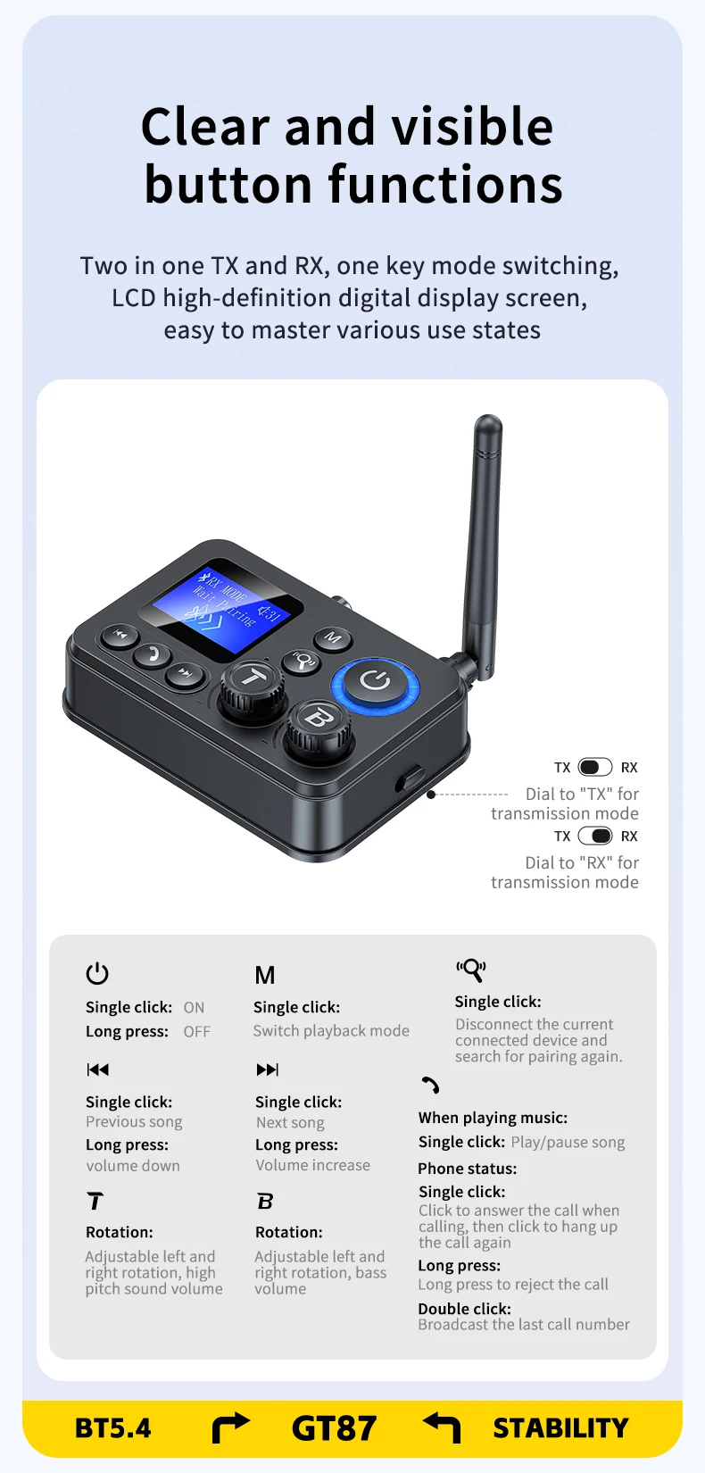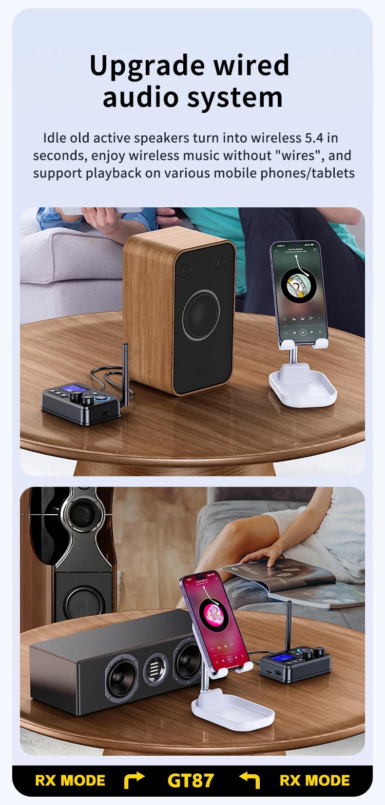 Versatilidade Dupla (Transmissor/Recetor): O GT87 funciona em dois modos: como Recetor, permitindo que colunas ou sistemas estéreo antigos recebam áudio wireless do seu telemóvel; e como Transmissor, permitindo que a sua TV ou PC envie áudio wireless para headphones ou colunas Bluetooth.